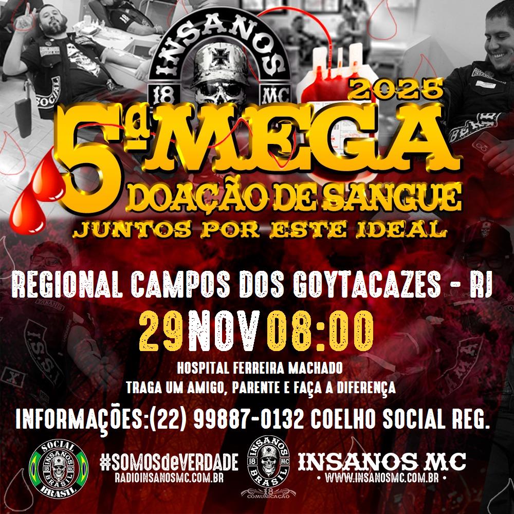 O Insanos Moto Clube estará promovendo uma grande ação para doação de sangue, será neste dia 29 de novembro. O Hospital Ferreira Machado (Campos dos Goytacazes) foi o escolhido para esta tarefa de pura humanidade, veja no banner abaixo todas as informações necessárias para que você também faça parte desta ação!